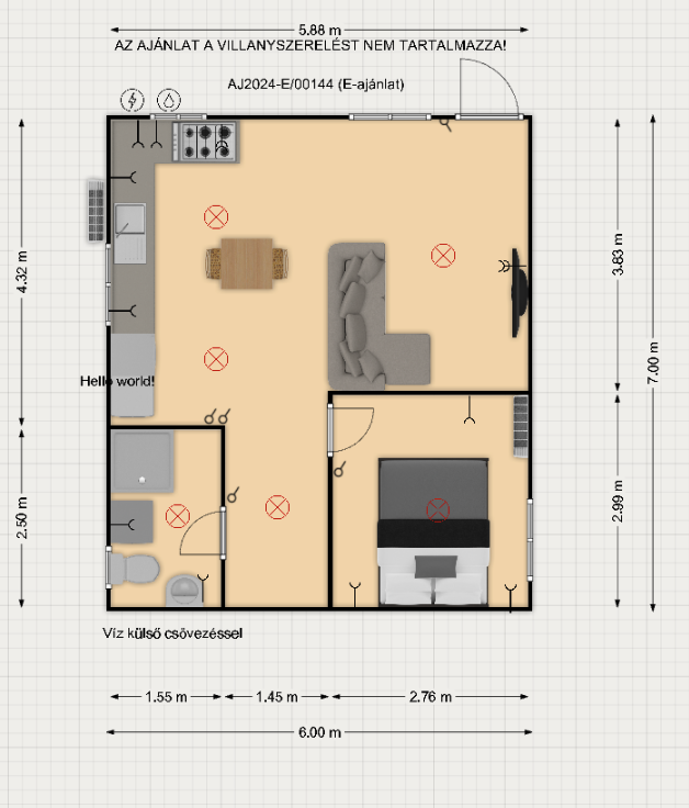 Méret 7 m x 6 m, belmagasság: 2,35 m, 42 nm alapterület