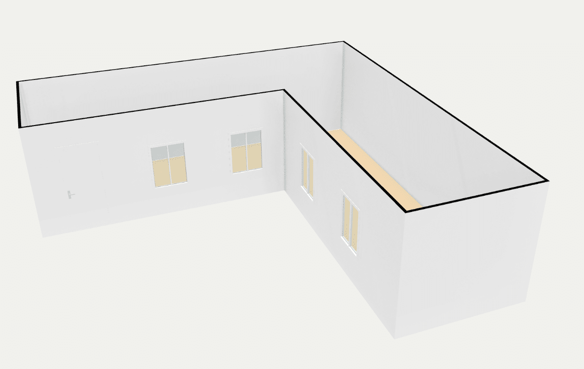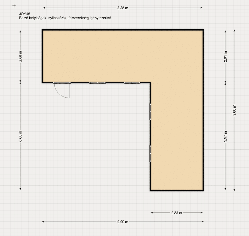 Méret 6 m x 9 m + 6 m x 3 m L alakban, belmagasság: 2,35 m, 45 nm alapterület