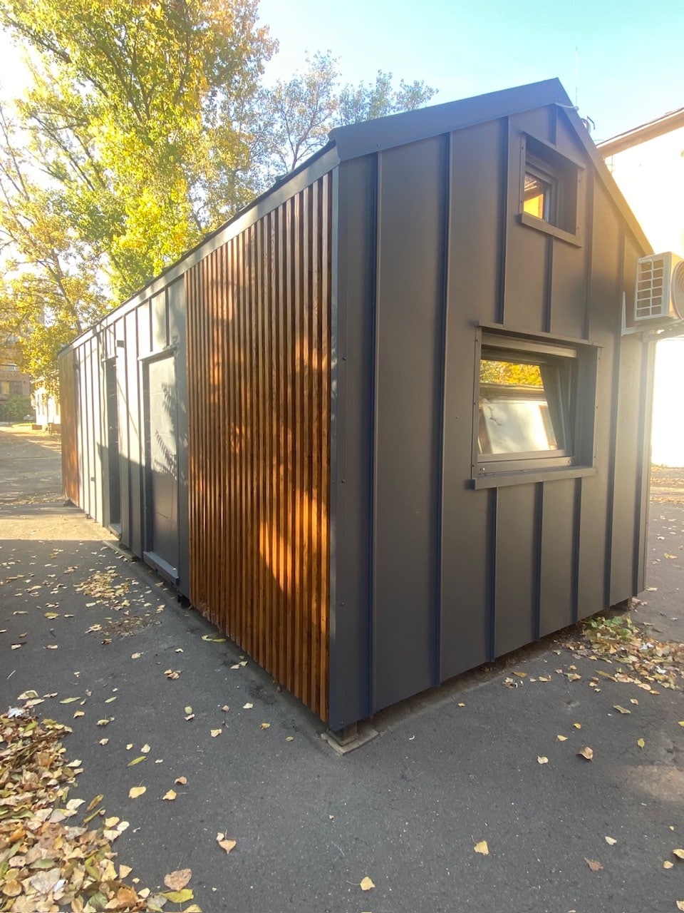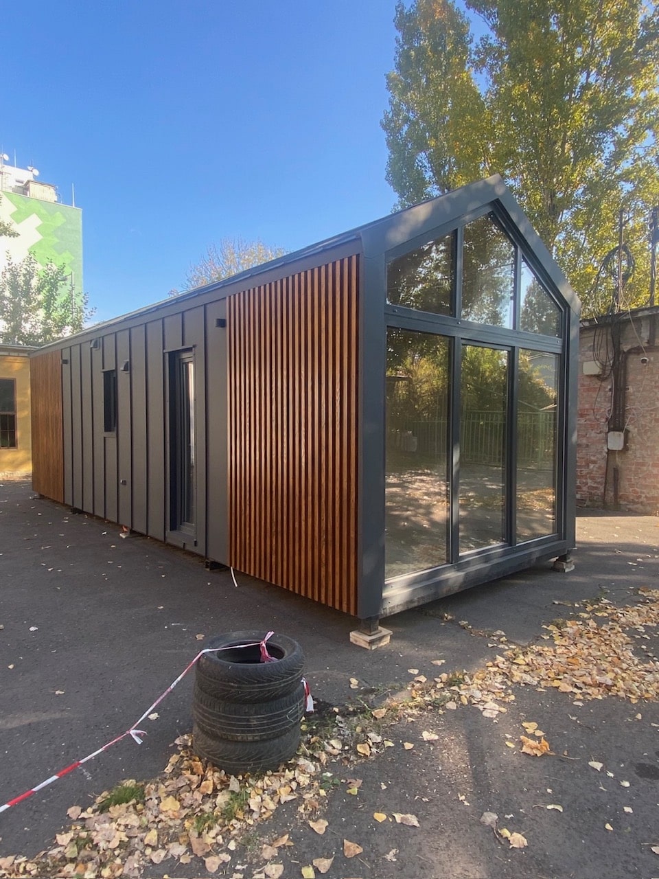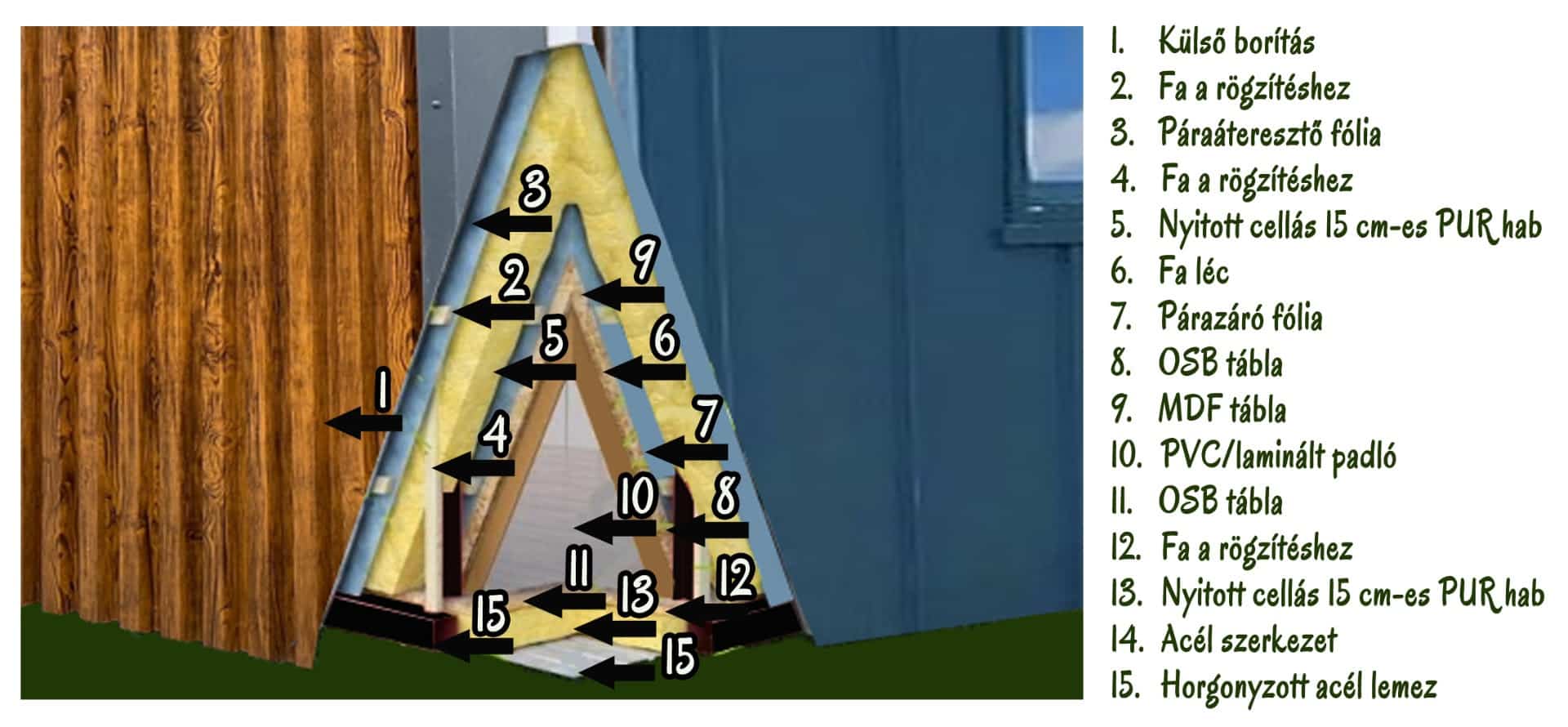 Külső falak: acél szerkezeti elemek mellett fémlemezekkel bevont homlokzat. A falakban fa lécek, OSB/MFP, szigetelés: nyitott cellás pur hab, membrán és párazáró fólia