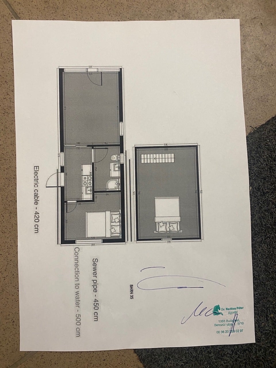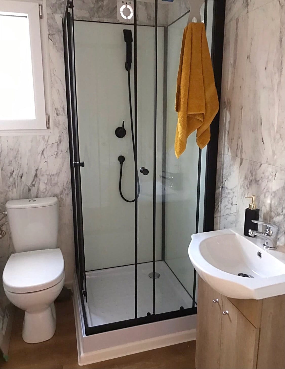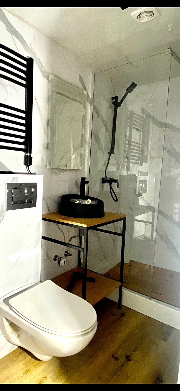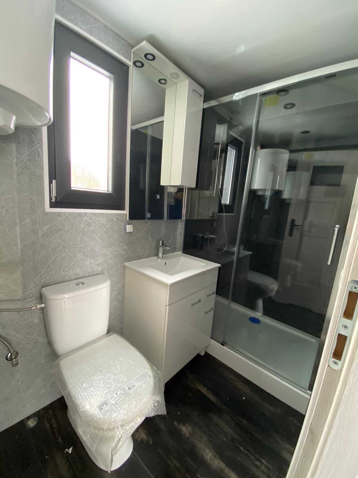 Komplett fürdőszobával (WC + kézmosó + Ariston bojler + tolóajtós zuhanykabin + páraelszívó + törülköző szárító radiátor (350W))